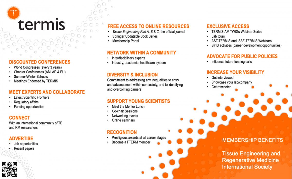 - Reduced registration fee to attend a TERMIS World Congress or TERMIS Chapter Conferences;